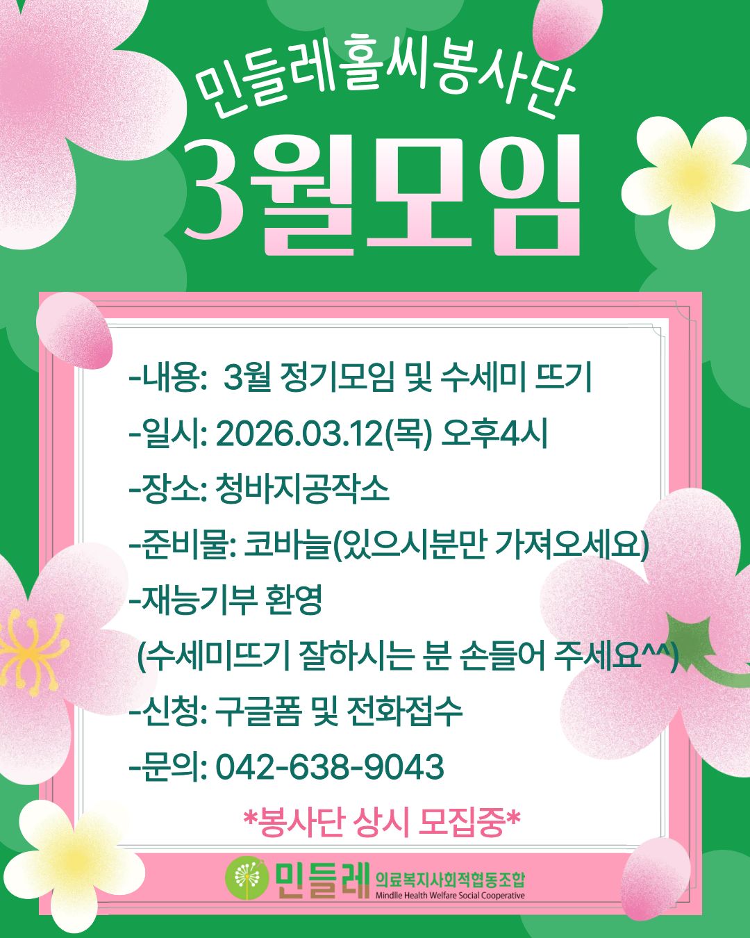 | 작성자 | 민들레의료복지사회적협동조합(mindlle) | 작성일 | 2026-03-03 | 조회수 | 602 |