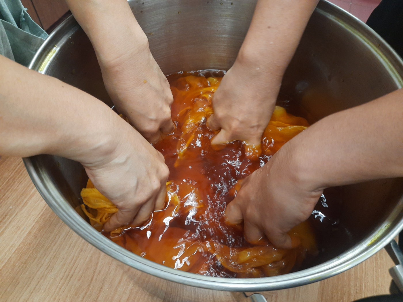 천연염색 - 치자염색 발도르프학교 수공예 선생님을 초빙하여 천연염색 모임을 가짐. 각자 염색하고 싶은 옷이나 가방을 준비하여 염색 오랜 시간 손으로 주무르고, 말리는 작업을 하며 이야기를 나눔