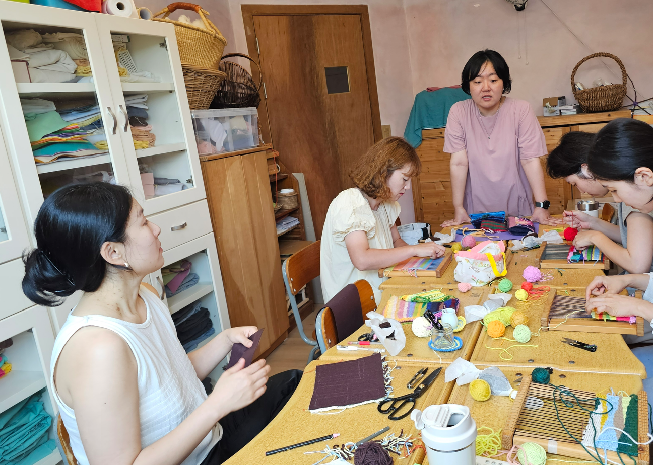 오늘은 도착 시간이 다들 늦어져서 채이 어머님이 준비해 주신 간식 먹으면서 쉬엄쉬엄 모임을 시작했습니다. 대부분 직조 작업은 끝을 내고, 안감 작업을 들어갔는데, 안감 디자인을 구상하는게 쉽지 않습니다. 고민은 짧게 빨리 선택하는 분도 있고, 정 반대인 분들도 있습니다. 각자의 성향에 맞게 시작된 작업이지만 각자의 아이디어를 보태어 더 나은 방법을 찾아가면 모임을 마쳤습니다.